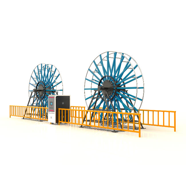 测试设备由两套轮组、两套独立动力单元、控制单元、辅助导轮等部分组成。双轮“∞”型收放线。双轮均具有动力,使用直流电机驱动,并均可四象限运行。双轮可快速切换收放线功能,恒速度收线,恒张力放线。系统根据试验要求,输入速度,试样直径。自动弯曲试验机解决35Kv及以上高压、超高压电缆的型式试验中第一项“弯曲试验”,存在的样品挠性大、重量大带来的试验人员操作难度和危险性,弯曲轮外径变化大、试验器具多等方面问题。具有可操作性强,操作简便,制造精良、性能可靠、适用线缆范围广等特点。