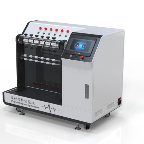 线材弯折试验机适用于插头引出线、电源线、USB线、耳机线、音频线、耳机连接线等成品线材的弯折测试或摇摆测试。本机是将试料固定在夹具上,并加一定荷重,试验时左右摆动,经一定数次后,检测其断线率,查看其总摆动次数,能自动计数,试料弯折至断线无法通电时,并能自动停止操作。