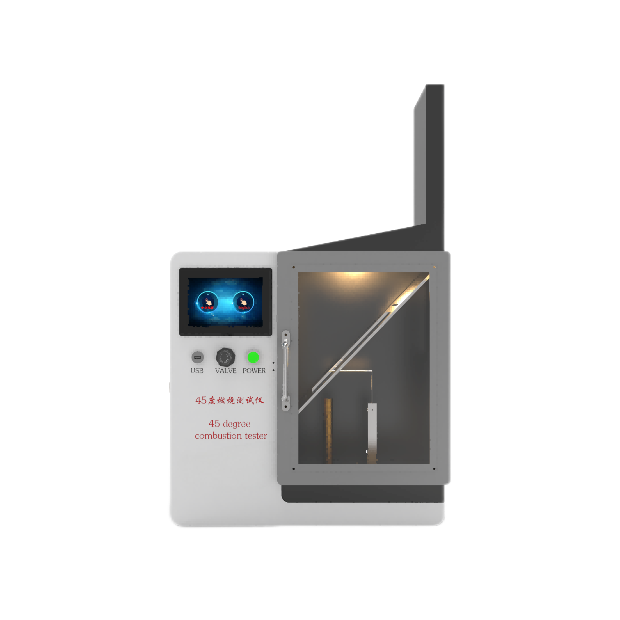 45°燃烧试验仪:燃烧试验仪的燃烧箱体用不锈钢材料制成,箱体应装有玻璃观察窗,箱的顶部装有排烟口,两侧下部各开有一排通风孔,箱内设有试样夹持框架装置与水平位置成45°,试验箱由定时、点火装置及安全控制系统等组成