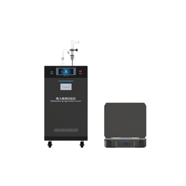 吸入制剂试验仪配置的检测取样装置,模拟给药的物理过程,可检测吸入气雾(粉雾、喷雾)剂的空气动力学粒径分布特性(APSD)即空气动力学雾滴(粒)直径小于一定大小(可达肺部有效部位)的占每剂含量的比例,用以平价吸入制剂的有效性;也可检测吸入制剂在使用起始、中期和末期的罐内(或不同罐之间)的单位释药计量均一性特性(DDCU),用以平价吸入制剂的安全性。