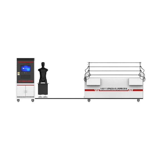 该装置主要由PLC+Windows系统,嵌入式工业电脑系统及软件、预热箱、轨道车及金属人模、燃烧器、储气装置、配气系统等组成,空气呼吸器穿戴在金属人体模型上,经由烘箱预加热后进行火焰吞噬测试并随后进行跌落测试在整个测试过程中空气呼吸器与呼吸模拟机相连接。火焰吞测试装置、燃烧器和金属人体模型的规格。测试过程中,金属人体模型穿戴符合XF10的消防员灭火服和符合 XF869的消防员灭火防护头套(未用于三次以上火焰与温度测试),移除非正常佩戴使用的保护遮盖物,测试过程中金属人体模型头部不佩戴头盔。