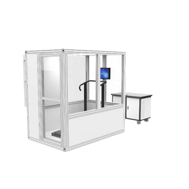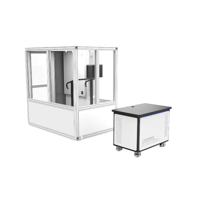 6.口罩总泄漏率测试装置检测仓:尺寸:长度:≥200 cm;宽度:≥130 cm;高度:≥215 cm;测试无横向气流干扰时的受试者头部上方30 cm处风速:≤0.2 m/s;测试横向气流时的受试者头部位置处风速约为2 m/s(需来自受试者前方、后方和侧方(左侧或右侧)3个方向);全不锈钢框架,真空钢化玻璃材质;仓内设置有可视化操控系统,可以与工作站控制软件同步;