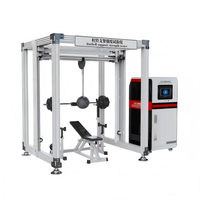 杠铃支架强度试验仪是用于检测杠铃支架承载能力和结构强度的设备,常见的有万能材料试验机和专门的健身器材静力加载实验机等PLC控制系统,支持自定义测试标准;